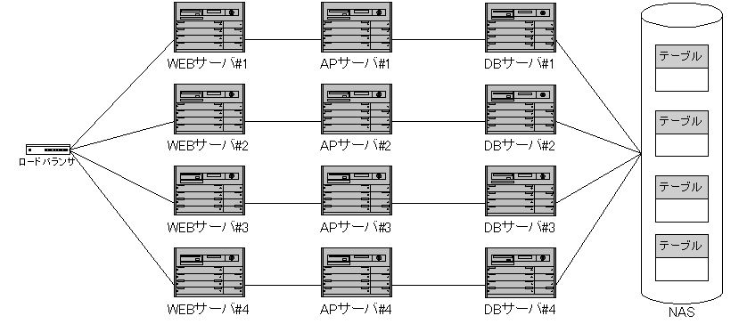 の構成で業務アプリケーションのため全てDBアクセスを伴う動的ページ生成のもと、上記システム全体で