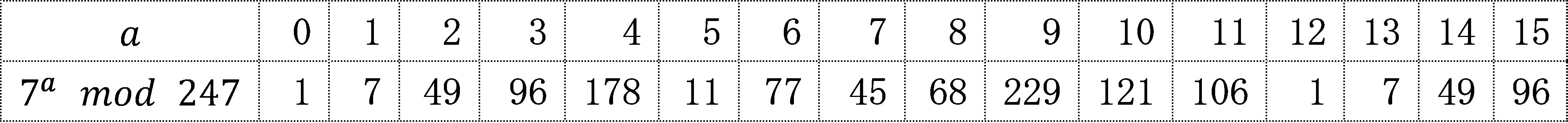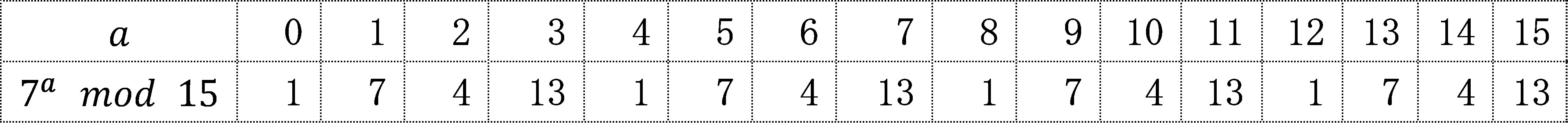\(7^a\;mod\;15\) を \((a\;=\;0,\;1,\;\ldots\;15)\)で求めてみます。